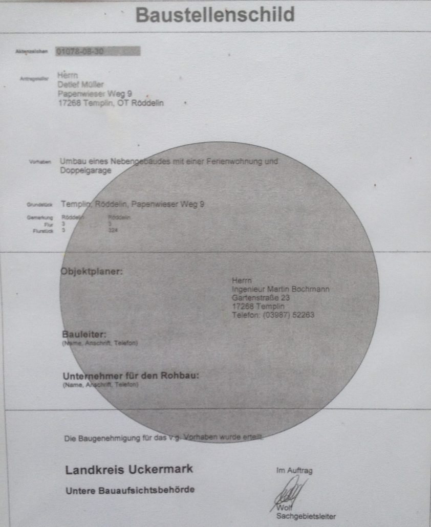 Offensichtlich hatte der Chef der Bauabteilung nach unserem Gespräch am 22.03.2022 vergessen, dass von mir erwähnt wurde, eine Baugenehmigung für die Errichtung der Gebäude bereits im Archiv der Stasi angefragt zu haben. Mittlerweile liegt diese vor und wird Bestandteil der Klage gegen die über mich verhängten Maßnahmen sein.
